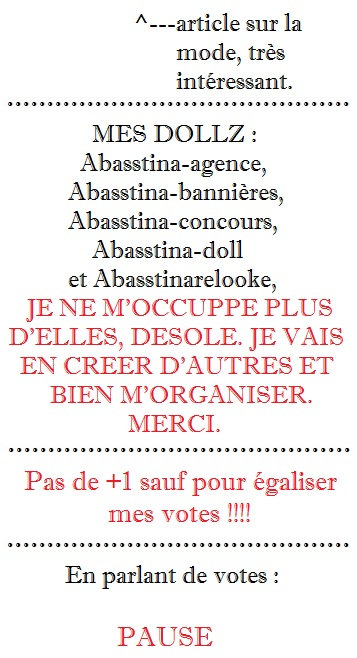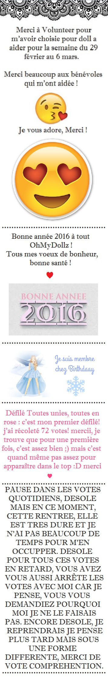 Ca a été une grosse décision surtout que j'étais pas mal avançée dans ce jeu mais le temps me manque. Je dois étudier, et aussi profiter de la vie, de mes amies et de ma famille. Il y a des choses lorsque l'on grandit qui ne nous plaisent pas autant qu'avant, et pour moi, c'est le cas avec ce jeu. J'ai passé de très bons moments ici et j'ai fais de super rencontres. Malgré cela, je dois arrêter. Je vous souhaite à tous une très bonne continuation sur ce jeu et aurevoir... :) <3